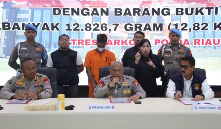 PEKANBARU – Ditresnarkoba Polda Riau mengelar konferensi pers pengungkapan kasus narkotika jenis sabu jaringan perdagangan narkoba internasional yang melibatkan pengendali dari Malaysia, Senin (28/4/2025). Kegiatan yang diselenggarakan di Media Center itu dihadiri oleh Wakapolda Riau Brigjen Pol. Jossy Kusumo didampingi…