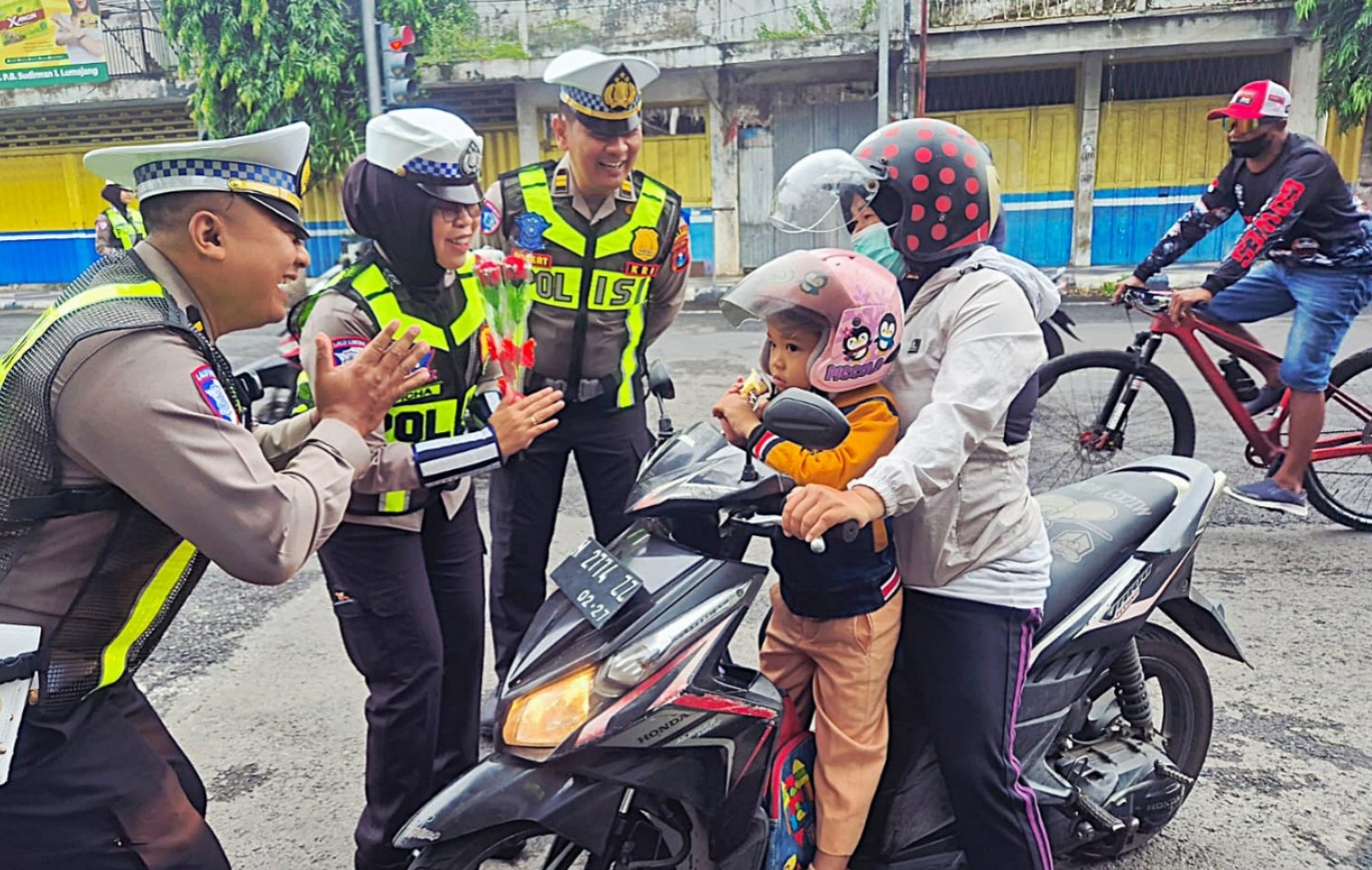 Selain membagikan bunga dan cokelat, petugas juga memberikan imbauan secara langsung kepada pengguna jalan mengenai pentingnya keselamatan dalam berlalu lintas.