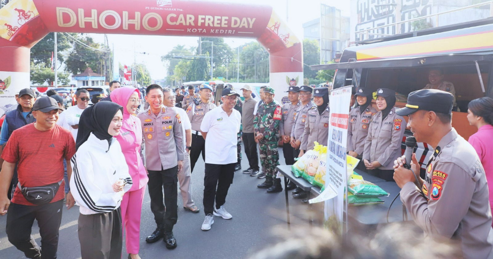 KOTA KEDIRI – Polres Kediri Kota Polda Jatim bersama Perum Bulog Kediri memanfaatkan momen Car Free Day (CFD) di Jalan Dhoho untuk menggelar Gerakan Pangan Murah.