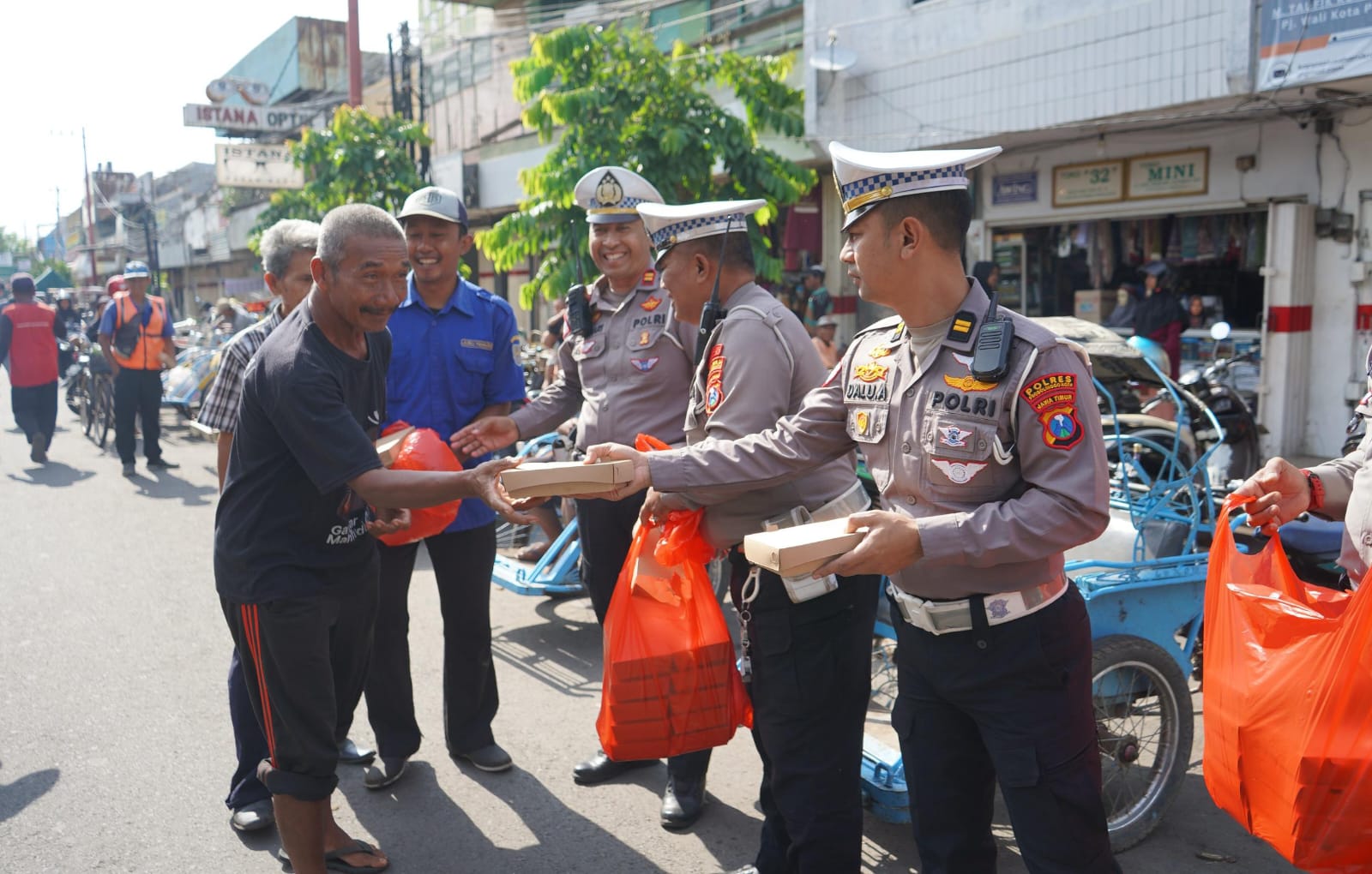 Kegiatan dimulai sejak pagi sekira jam 08.00 WIB, di mana anggota Satlantas Probolinggo Kota membagikan nasi bungkus secara langsung kepada warga.