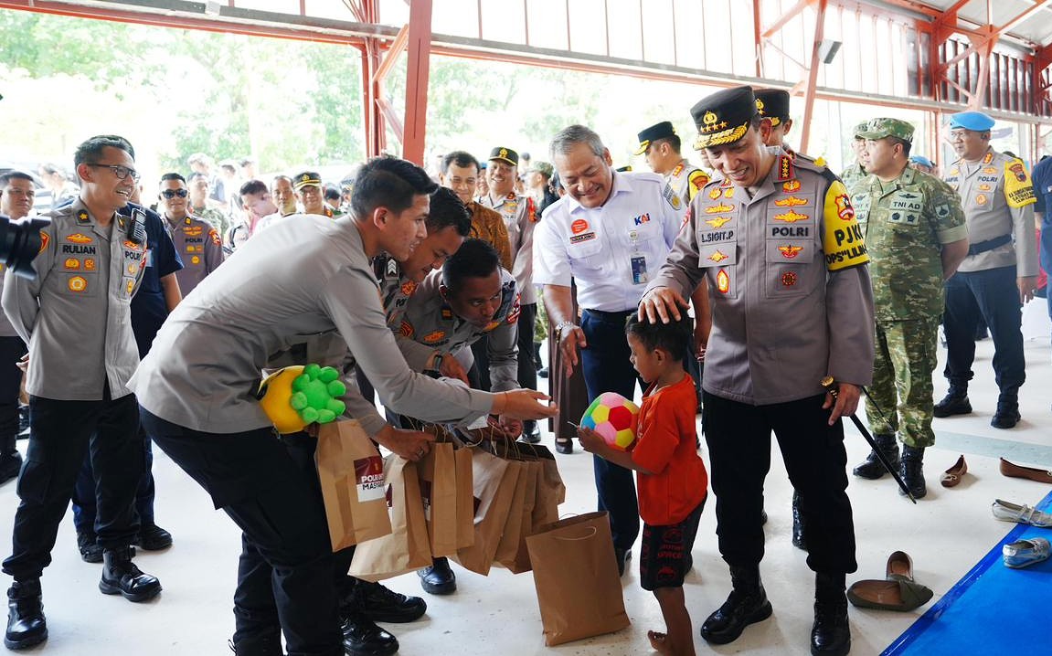 Kapolri juga menyempatkan diri menyapa para penumpang di ruang tunggu keberangkatan serta membagikan goodie bag sebagai bentuk perhatian dan dukungan kepada masyarakat yang akan melakukan perjalanan. Selain itu, Kapolri menyerahkan paket bantuan sosial secara simbolis kepada perwakilan petugas lintas sektor, meliputi unsur TNI, Polri, Dinas Perhubungan, tenaga kesehatan KAI, dan Polsuska.