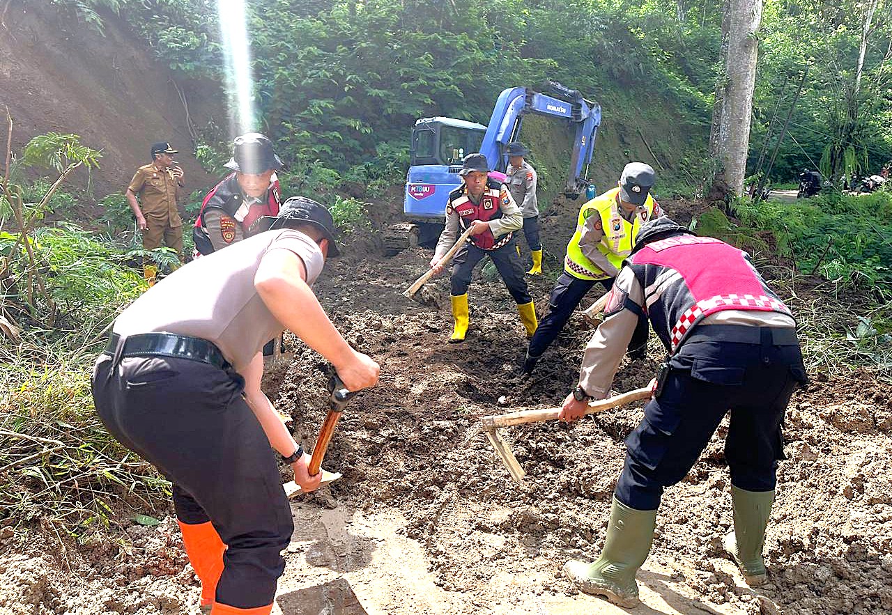 Dengan semangat kebersamaan dan kerja keras tim gabungan, pembersihan material longsor terus diupayakan menggunakan alat berat maupun secara manual.