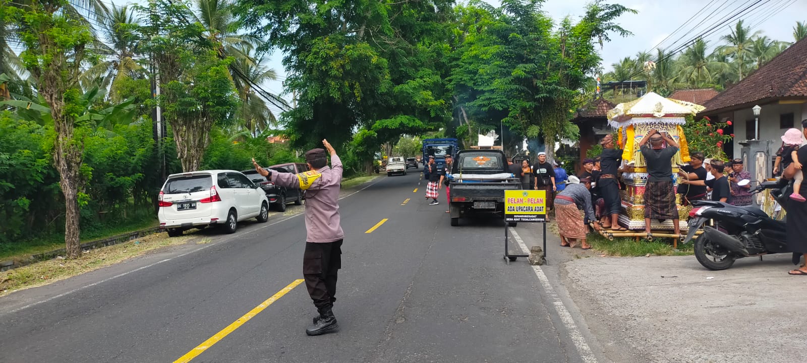 JEMBRANA – Sebagai wujud kehadiran Polri di tengah masyarakat dalam memelihara situasi kamtibmas dan kelancaran arus lalu lintas, Bhabinkamtibmas Kelurahan Tegalcangkring, Aiptu I Ketut Bagus Sarjana, melaksanakan pengamanan kegiatan upacara adat Ngaben di Desa Adat Tegalcangkring, Kecamatan Mendoyo, Kabupaten Jembrana, Rabu (29/10/2025).