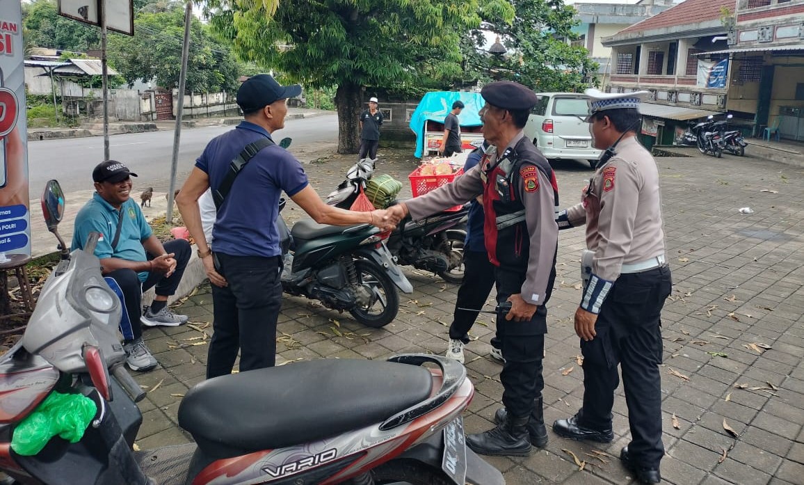 Dalam kegiatan tersebut, petugas berdialog dengan warga sekitar termasuk petugas parkir bernama Putu Pratama guna meningkatkan kewaspadaan bersama.