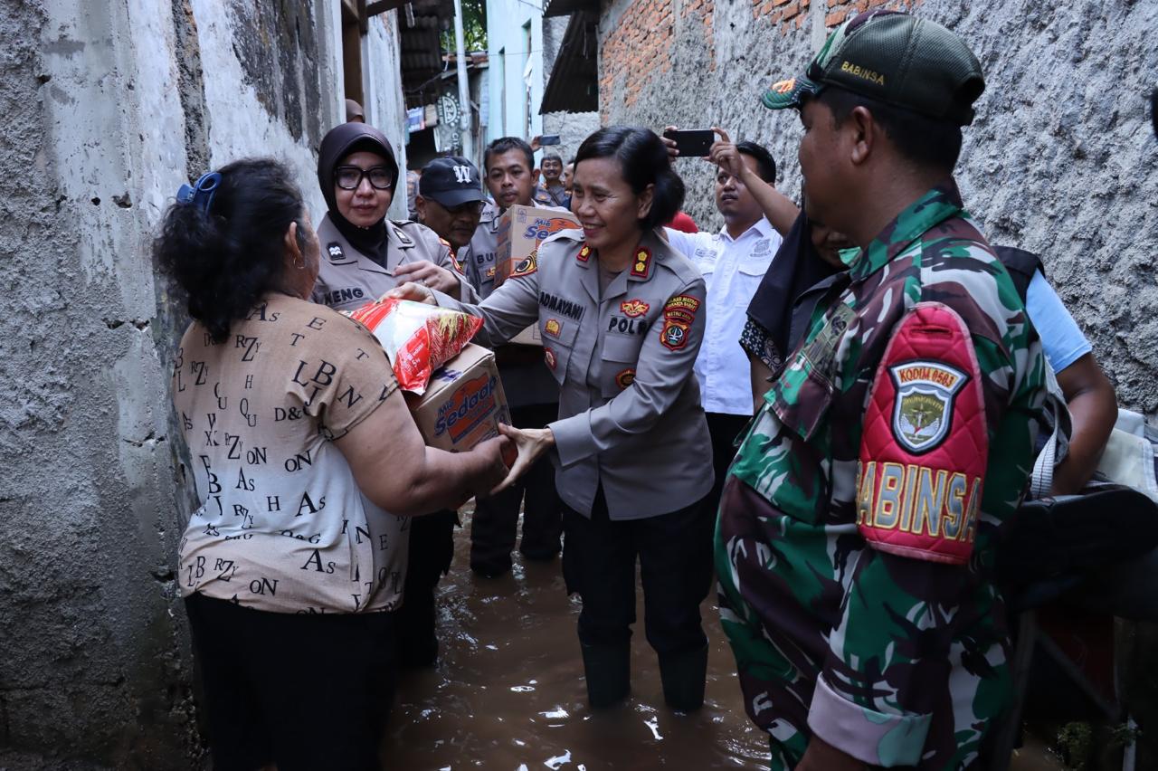 JAKARTA – Polwan Polres Metro Jakarta Barat turun ke lokasi banjir di permukiman warga di kawasan Kebon Jeruk. Para srikandi Bhayangkara ini memberikan snack hingga sembako kepada warga yang terdampak banjir.