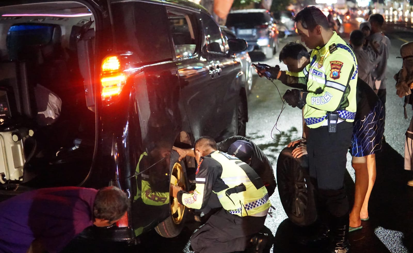 Dengan cekatan, Polisi lalu lintas yang dikomandoi Kanit Turjawali Ipda Rizky Dwi langsung mengeluarkan perlengkapan dan membantu pemudik tersebut mengganti ban yang bocor.