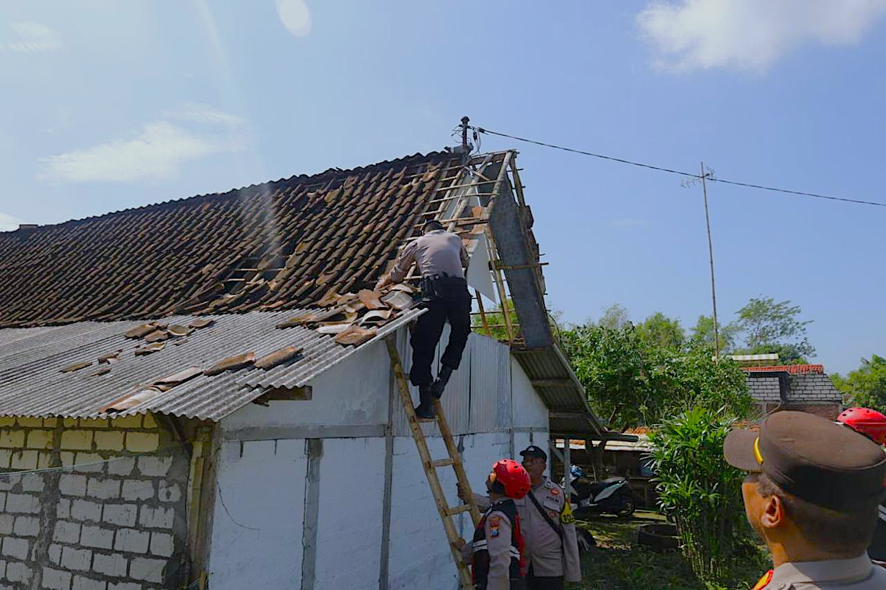 Puluhan personel Polres Tuban bersama BPBD dan unsur terkait langsung terjun ke lokasi untuk membantu proses evakuasi, pembersihan puing-puing bangunan, serta membantu warga membersihkan pohon yang mengganggu akses jalan.