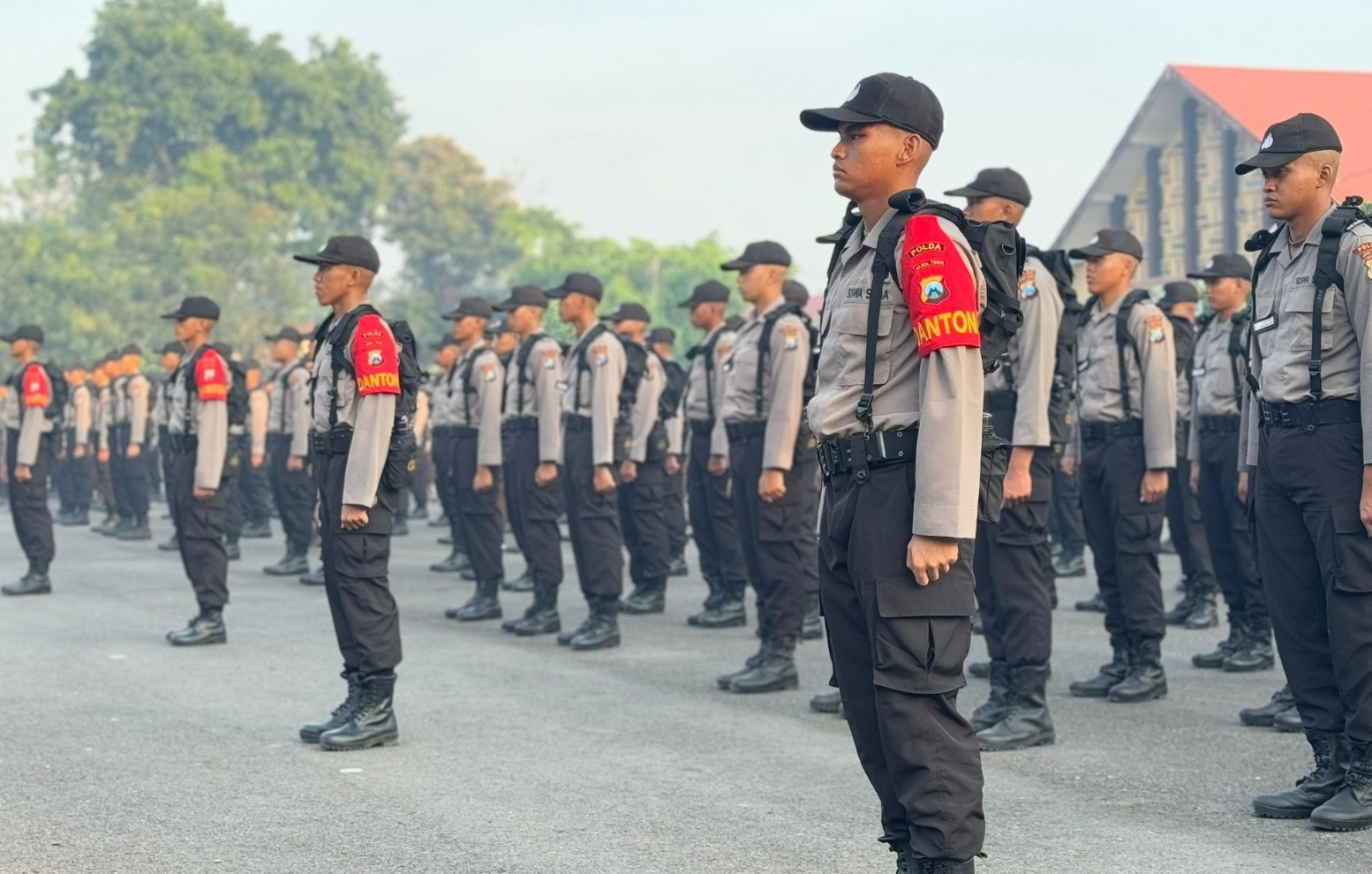 MOJOKERTO – Lapangan Catur Prasetya Sekolah Polisi Negara (SPN) Polda Jawa Timur, di Kecamatan Bangsal, Kabupaten Mojokerto, tampak dipenuhi oleh para siswa Diktuk Bintara Polri, Senin Pagi, (4/8/2025).